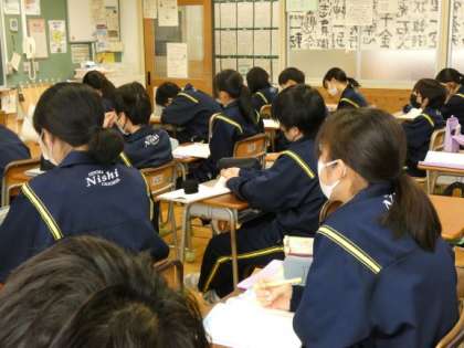 2月21日(水)授業の様子(1年1組 国語) 公開日 2024/02/21 更新日 2024/02/21 今日の西中 1年生の国語は、随筆の学習です。 随筆とはどういうものか、復習をしました。 その後、グループに分かれ、随筆の構成や描写・表現の工夫について話し合いを行いました。