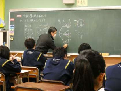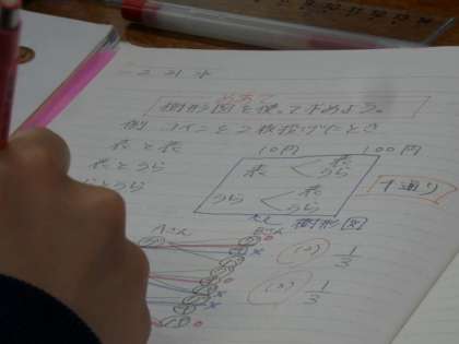 2月21日(水)授業の様子(2年2組 数学) 公開日 2024/02/21 更新日 2024/02/21 今日の西中 2年生の数学は、起こりうる確率について、樹形図を使って考えました。 落ちがないように、よく考えて樹形図を作り、問題に取り組みました。 コインの裏表やじゃんけんでの勝ちやあいこの確率など、問題が複雑になっても基本の考え方を大切にして、意欲的に解決していました。