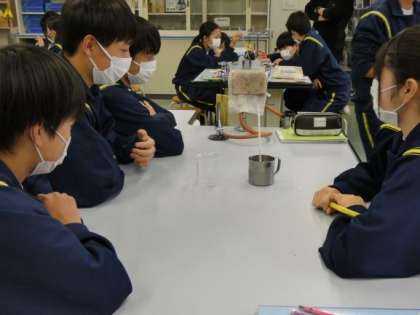 理科室の露点は何度かを調べるため、コップの表面に水滴がついたときの温度を正確に計ろうと集中して実験を行っていました。
