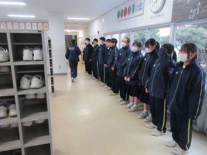2月22日(木)あいさつ運動 公開日 2024/02/22 更新日 2024/02/22 今日の西中 あいさつ運動は、2年3組が当番でした。雨のため、玄関で行いました。元気で爽やかなあいさつで、登校する生徒を迎えていました。