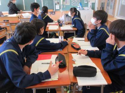 3月1日(金)授業の様子(2年1組 国語) 公開日 2024/03/01 更新日 2024/03/01 今日の西中 短歌の学習です。歌われている情景や作者の思いを想像しながら読み、内容や表現のしかたについて感じたことを班で話し合いました。