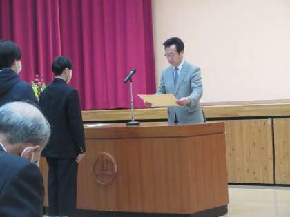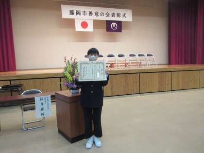 3月2日(土)藤岡市善意の会表彰式 公開日 2024/03/04 更新日 2024/03/04 今日の西中 54回目となる藤岡市善意の会表彰式が藤岡市民ホールで行われました。本校からは善意の標語で、1年生男子1名が優秀作として表彰されました。おめでとうございます。 優秀作 「一人ひとりの優しさで いっぱい咲いたよ 笑顔の花」