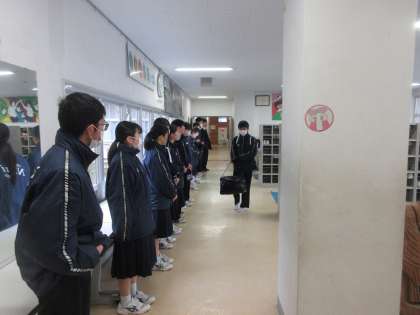 3月6日(水)あいさつ運動 公開日 2024/03/06 更新日 2024/03/06 今日の西中 あいさつ運動は、3年2組が当番でした。雨のため、室内でのあいさつ運動です。元気で爽やかなあいさつで、登校する生徒を迎えていました。