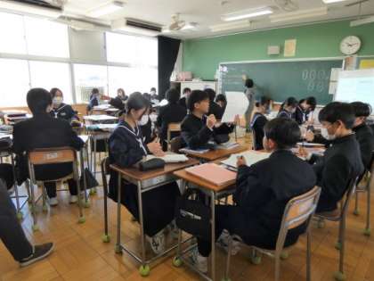 3月21日(木)授業の様子(1年2組 英語) 公開日 2024/03/21 更新日 2024/03/21 今日の西中 1年生の英語では、長文の読解に取り組みました。 まず、一人一人で読み、グループに分かれて、よりよい表現になるよう話し合いました。 「日本語らしい言い回し」を意識して、話し合っている様子が見られました。