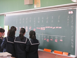 写真は、学級での役割分担をしている場面ですが、こうした決め事の機会だけでなく教科の授業の中でも、黒板に意見や考えを書く際はネームプレートを添え、自分の考えが活かされている実感を持たせ、学習意欲の維持向上の一助とします。