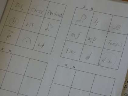 ビンゴの枠に自分が選んだ音楽記号を入れ、楽しく活動を行いながら、記号の意味などを確認していきました。