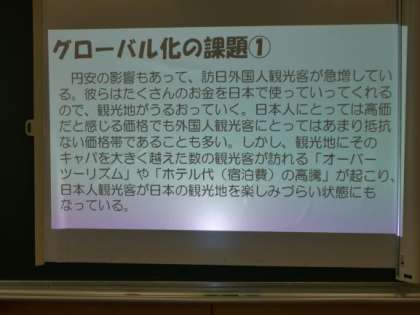 グローバル化の課題として、訪日外国人観光客の増加によって起こった問題で、抑制をかけるのがよいかどうかについて話し合いました。