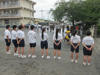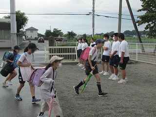 中学生が一貫校の小学校を訪れ、地域の方とともにあいさつ運動を行う訪問あいさつが行われました。写真は美土里小学校の様子です。