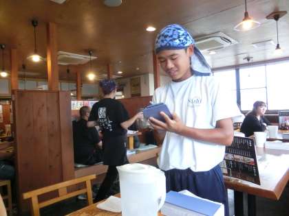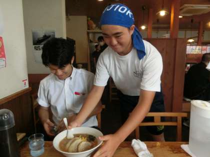 ラーメンともやでは、お冷や料理をお出ししたり、お客様が帰った後のテーブルを片付けたりと活動しています。