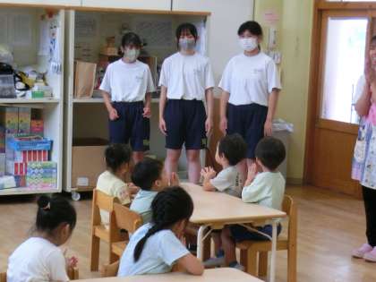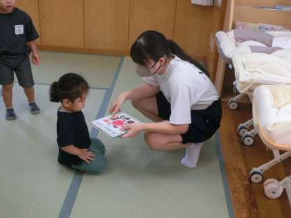 9月3日(火)チャレンジウィークの様子(吉祥保育園) 公開日 2024/09/03 更新日 2024/09/03 今日の西中 吉祥保育園では、園児たちに混ざって、お話をしたり、遊んだり、準備の手伝いをしたり活動しています。目線を合わせながら、優しく丁寧に園児たちと接していました。