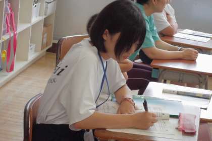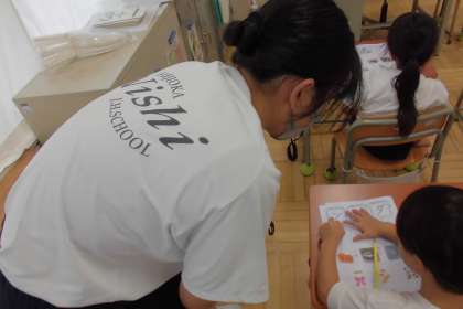 体育の授業で一緒に活動するだけでなく、児童に勉強内容を教える活動も行っています。文字の書き順を教えたり、先生の説明を一緒に聞いたりしていました。