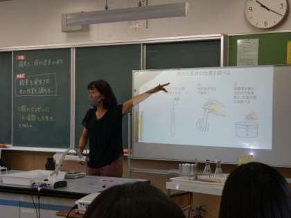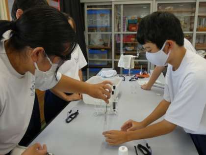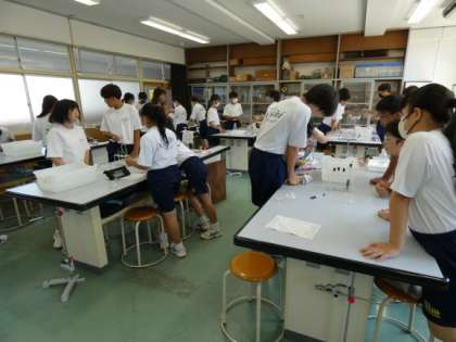 9月13日(金)授業の様子(1年2組 理科) 公開日 2024/09/13 更新日 2024/09/13 今日の西中 気体の性質について学習しています。 二酸化マンガンに薄い過酸化水素水を加え、酸素を発生させました。 いろいろな方法で、酸素の性質を調べていました。 安全に気を付け、変化の様子を友達と共有しながら意欲的に活動していました。