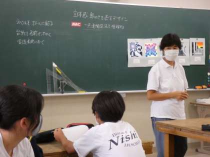 10月3日(木)授業の様子(2年1組 美術) 公開日 2024/10/03 更新日 2024/10/03 今日の西中 立体感奥ゆきを表すデザインの制作に取り組んでいます。 今日は、一点透視図法について学びました。 見本のデザインを見て、作品の中の一点を見付けました。 早く作りたいな、という気持ちが高まったのではないかと思います。