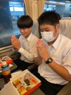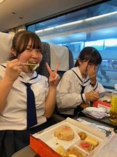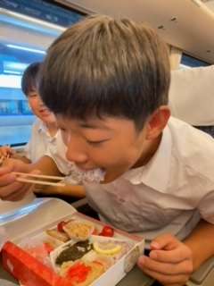 サンダーバードに乗車して、お弁当を食べています。幸せそうです。