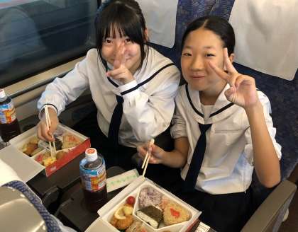 サンダーバードに乗り換えランチタイムです。「お弁当楽しみー」と言っていた生徒もいました。