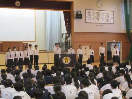 10月18日(金)西翔祭(閉会行事・生徒会役員引継ぎ式) 公開日 2024/10/18 更新日 2024/10/18 今日の西中 楽しい時間はあっという間に過ぎていきます。 ニシリンピックの表彰、準備に一生懸命取り組んだ実行委員の紹介を含めた閉会行事と、新生徒会本部役員の任命式と、新旧役員の引継ぎ式が、体育館で行われ、思い出深い一日が終わりました。