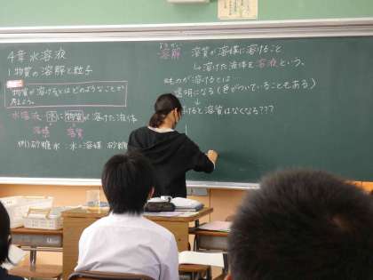 11月5日(火)授業の様子(1年1組 理科) 公開日 2024/11/06 更新日 2024/11/06 今日の西中 溶けるとはどういうことか、考えました。 モデル図を使って溶けるとはどういう状態になることかを予想し、話し合いました。 このような視点で「溶かす」ということを見てみると面白いですね。