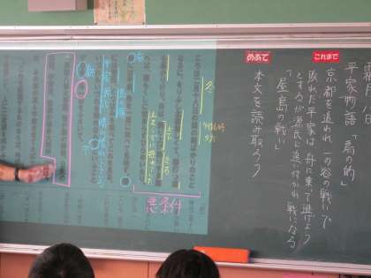 11月8日(金)授業の様子(2年1組 国語) 公開日 2024/11/08 更新日 2024/11/08 今日の西中 「平家物語」の那須与一が的を射ようとする緊迫した情景を、古典の独特な言い回しや用語を理解しながら読み取っていました。 タブレット上にある本文をプロジェクターで黒板に投影しながら要点を押さえるなど、ICTの効果的な活用も行われていました。