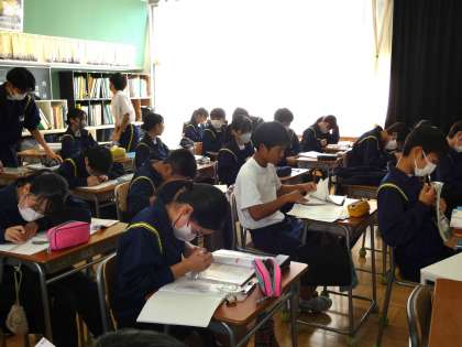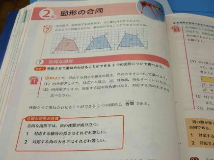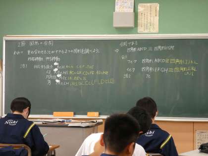 11月12日(火)授業の様子(2年2組 数学) 公開日 2024/11/12 更新日 2024/11/12 今日の西中 図形の合同の学習に入りました。 小学校での学びを思い出し、合同な図形の性質をまとめ、それを活用して練習問題に取り組みました。