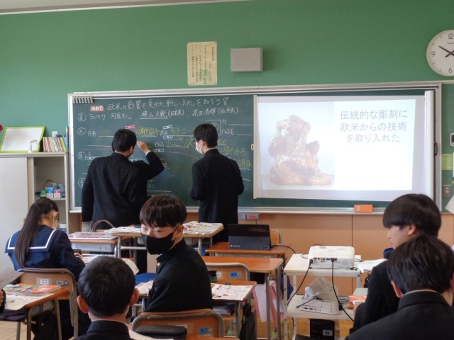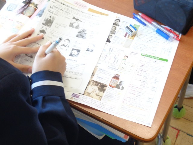 3年生の社会科で明治時代の文化について調べていました。先生の作成したワークシートの課題を資料集や教科書を使って調べます。みんな意欲的に調べたり黒板に出て答えを書いたりしていました。新旧のお札の肖像画にも使われている有名な文化人が続々と登場。プレゼン資料をつかった先生の解説を聞きながらその業績を学びました。