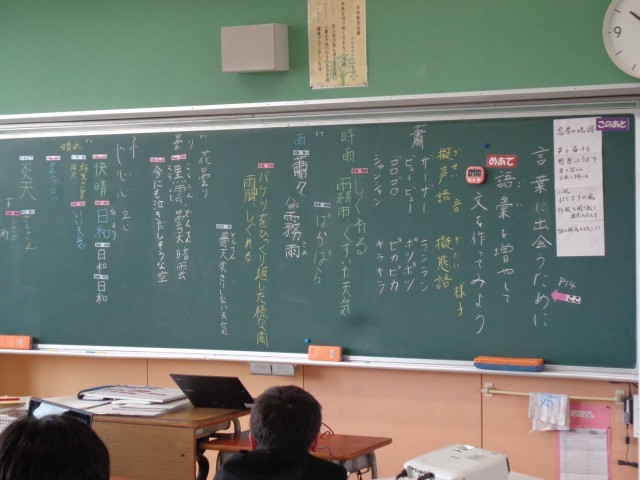今日のめあては「語彙を増やして文章を作ってみよう」。まずは教科書の巻末資料「語彙ブック」を使って、「情景を表す言葉」を調べました。