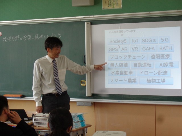 今日は、近い将来訪れる「Society5.0」という高度に技術が進歩した社会に向けて、これからの「技術科」で学ぶ事を考えました。先生が見せてくれた映像資料では、Society5.0はまるでSFのような社会でしたが、よく見ると、もうすでに実用化されているものもありました。将来このような社会を生きていく生徒達が「技術科」でどんなことを学んでいくのでしょうか。生徒達は、興味津々で先生の話を聞き活発に応答していました。