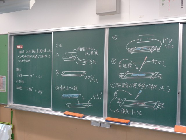 「化学変化とイオン」の単元で、今日は、「酸性、アルカリ性を示す物の正体」を調べる実験です。