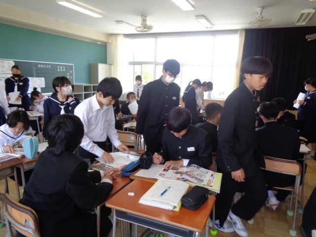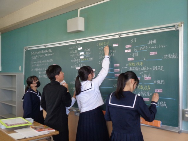 2年生の社会科は歴史の学習に突入しています。2年1組は「第4章 近世」の最初の授業。フランシスコ・ザビエルは「なぜ」「どのように」来たのか、という課題を解決するために、ヨーロッパの歴史を調べました。1年生の歴史の授業で学んだヨーロッパの歴史は「ローマ帝国」まで。その後、ザビエルの時代までの約1000年のヨーロッパの歴史を一気に学びました。特に今日はルネサンスと宗教改革についてワークシートを使って調べました。仲間と協力し合って教科書や資料集で調べます。最後にルネサンスの美術を先生がパワーポイントで紹介。素晴らしい芸術作品の数々が生まれたヨーロッパのルネサンスです。