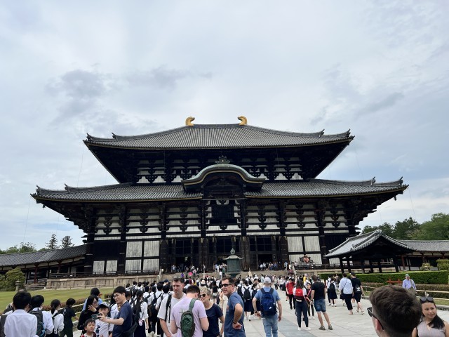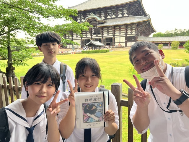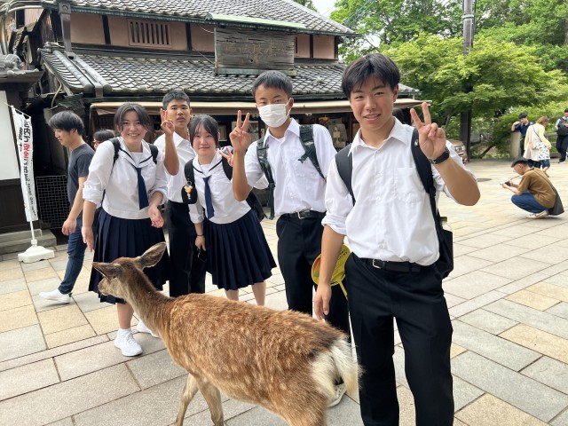 世界遺産に横たわる鹿に驚いている西中生でした。東大寺の大仏も迫力満点です。このあと、16:00まで奈良を班別活動していきます。
