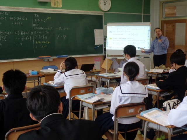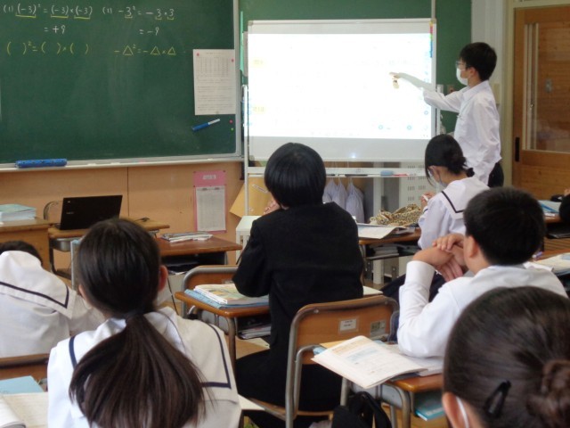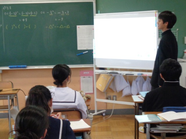 1年3組の数学の授業では「累乗の計算」を学んでいました。負の数の累乗はプラスかマイナスか。(ー6)²と-6²の違いを近くの人と説明し合い、みんなの前で発表しました。「なぜそうなるのか」をきちんと説明できて、みんなもよくわかったところで、練習問題に挑戦。2乗の場合、3乗の場合、()のある場合、いろいろな場合について、「なぜそうなのか」を考えながら問題を解きました。