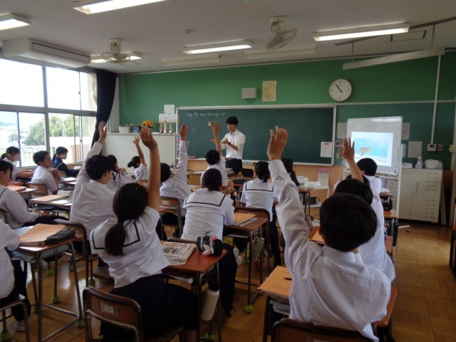 今日の1年2組の英語は、新しい単元に入りました。導入の活動ではみんな活発に挙手をして英語での応答をしていました。