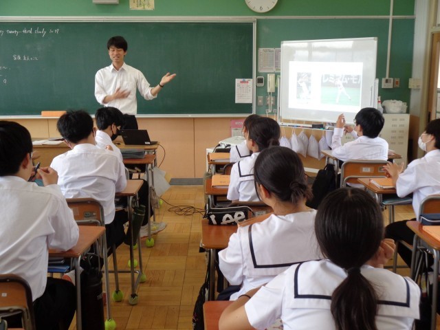 2章の活動は「My Hero」の紹介です。先生がお手本で自分自身の「My Hero」の紹介をしてくれました。みんな興味深く先生のお話を聞き、よく英語を聞き取れていました。その後、小学校での「My Hero」での活動を懐かしく復習しながら、2章の単元のめあてをみんなで確認しました。これからの学習に対して大いに意欲が高められた1時間でした。