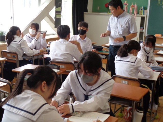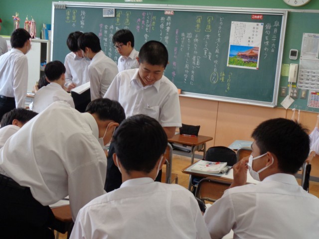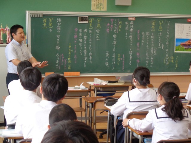 3年1組の国語の授業。「俳句」の単元です。教科書で紹介されている俳句について、季節と情景についてみんなで考えました。何人かで意見交流した後、クラスみんなで考えをまとめます。今日の俳句は「いくたびも雪の深さを尋ねけり」「跳箱の突き手一瞬冬が来る」です。