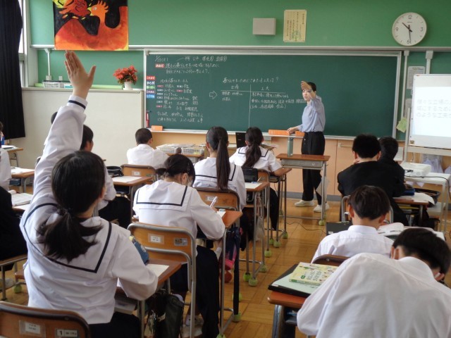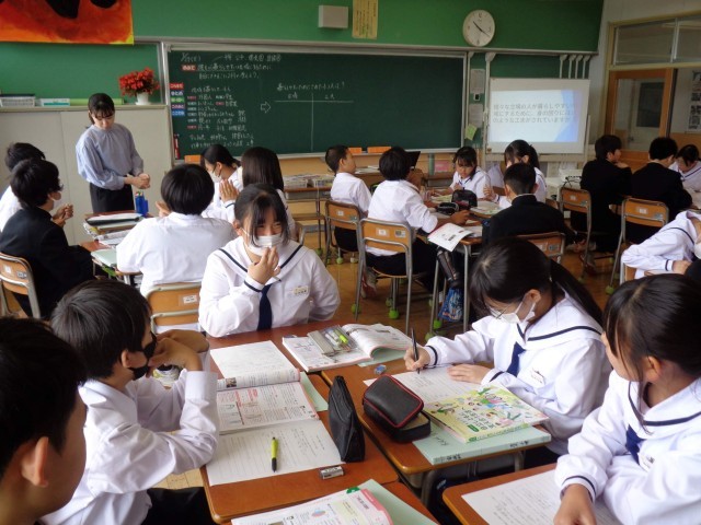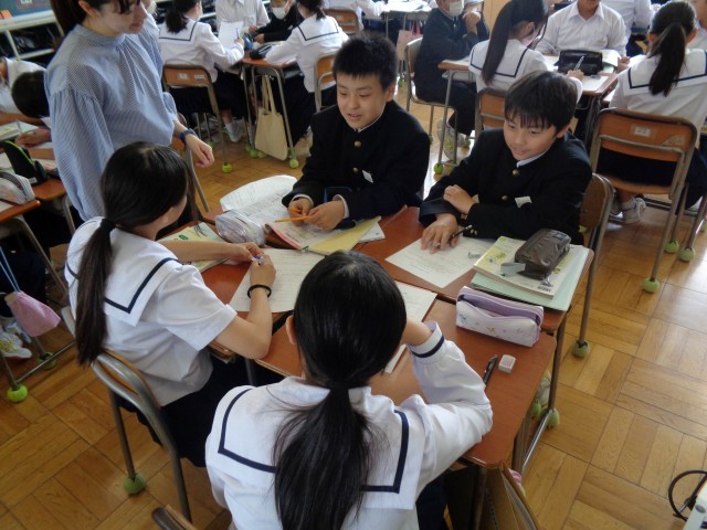1年1組の家庭科の授業。今日のめあては、「誰もが暮らしやすい地域のするために自分でできることは何か考えよう」です。グループで話し合い活動をした後、全体で意見交流をしました。グループでも全体でも活発に意見を出し合っていました。意見に対して拍手をするなど、認め合いの姿が見えてとてもよかったです。