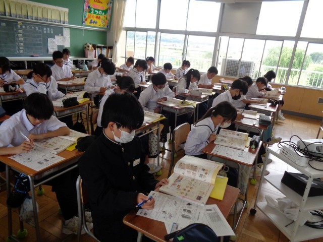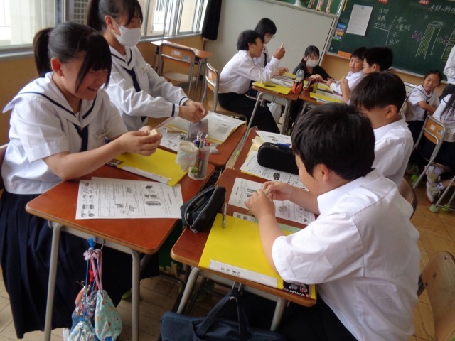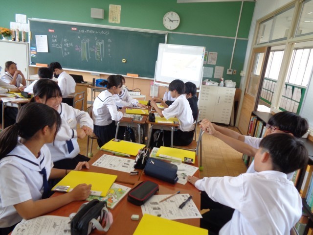 1年2組の技術科の授業では、「木材」について学んでいました。木材にはどんな特性があるのかな?先生が準備した縦の木目の角材と横の木目の角材の強度を比べてみました。細い角材ですが、縦の木目のものはなかなか折れず、横の横の木目のものはポッキリ折れました。生徒達はびっくり。実験で木目による強度の違いがわかったところで、ワークシートを使って木材の特性を調べました。実験で興味関心が高まったので、ワークシートの課題に意欲的に取り組んでいました。