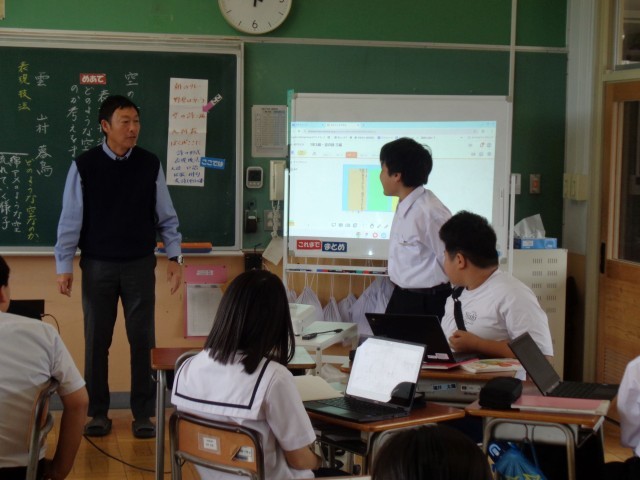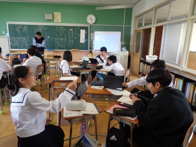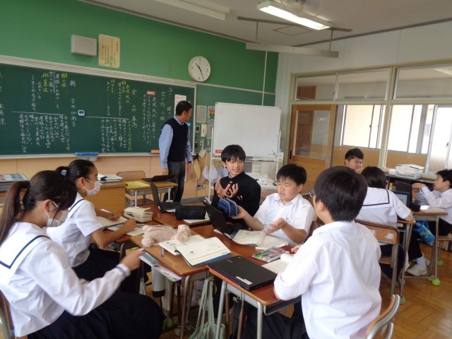 1年3組の国語の授業。「言葉に立ち止まる」の単元で3編の空の詩を学習していました。山村暮鳥の「雲」、吉田加南子の「朝」、木坂涼の「魚と空」です。それぞれの詩が「どんな空」を表現しているのかを発表し合い、詩の世界観を味わいました。また、それぞれの詩の技法について話し合い、気付いたことを発表しました。グループでも全体でも活発な意見交流が行われていました。