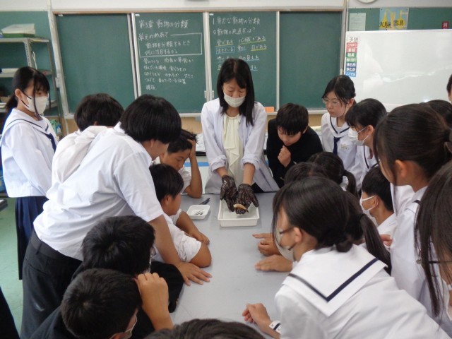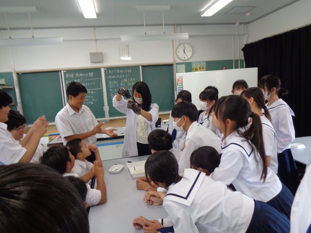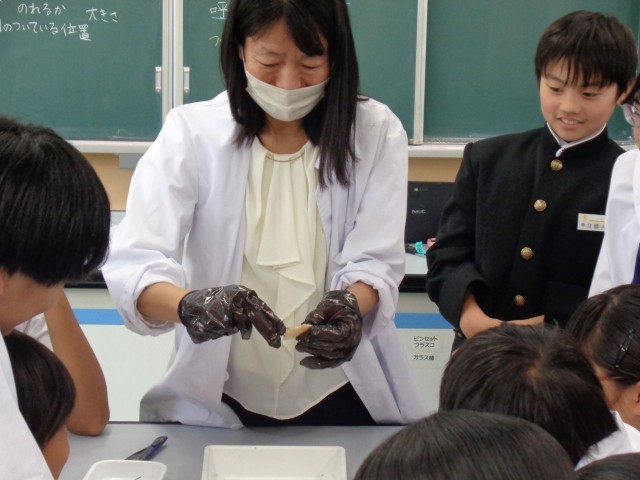 1年1組の理科の授業。これから「動物の体のつくり」を学習するので、今日はイワシの体のつくりを調べるべく、班ごとにイワシ(煮干し)の解剖をして体の中の作りを観察しました。その後、先生がみんなを集めてエビの解剖を実施。どうやら先生の晩ご飯のおかずになるエビの様です。先生が解剖するエビを見せると、口々に上がる声は「おいしそう」。いやいや、調理実習ではありませんよ。お寿司を握る仕草まで登場。それでも解剖中の先生からの発問に反応良く答える生徒達。楽しみながらしっかりと学んだ1時間でした。
