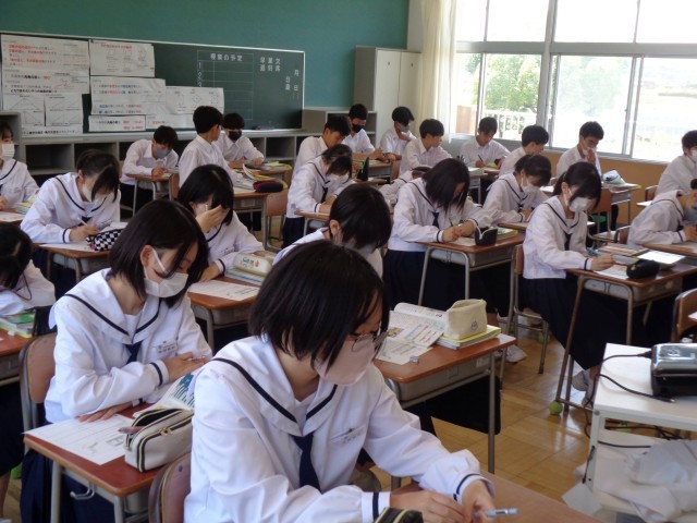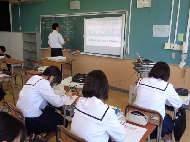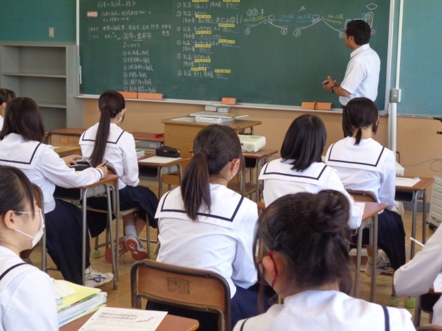 2年2組の社会科では日本各地の気候について学習しました。南北に細長い日本の国土では、一つの国とは思えないくらい地域によって気候が大きく異なります。川腹康成の小説の冒頭「国境の長いトンネルを抜けると雪国であった」は日本の気候を象徴していますよね。なぜこのような特色があるのか。生徒たちがワークシートでそれぞれの地域の特色を調べた後、先生と一緒に「季節風」「緯度」をキーワートに理由を考えました。