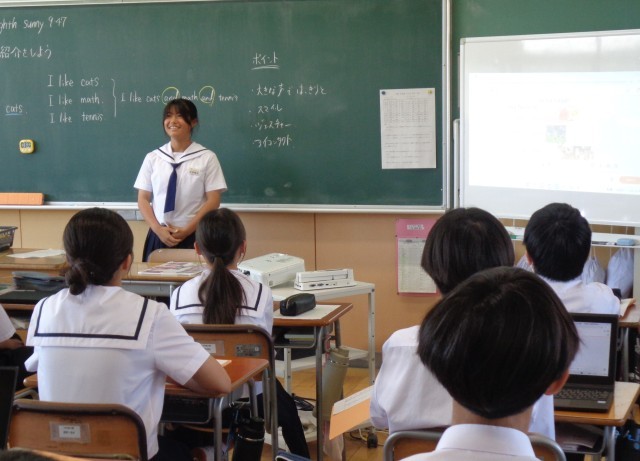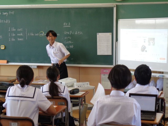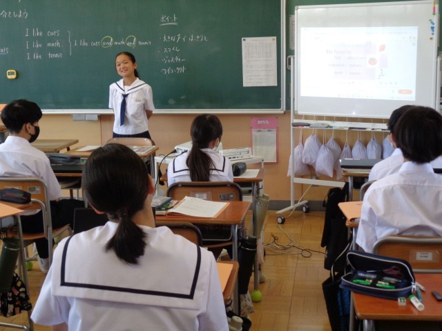 1年2組の英語の授業ではALTの先生に自己紹介をしようの学習のゴールに到達していました。プレゼンの画面と自己紹介文を英語で作って、一人一人ALTの先生に向かって自己紹介します。発表の前に近くの友達を相手に練習をしていざ本番。スマイルとアイコンタクトを忘れずに、クリアボイスで発表していました。とてもよい発表でした。