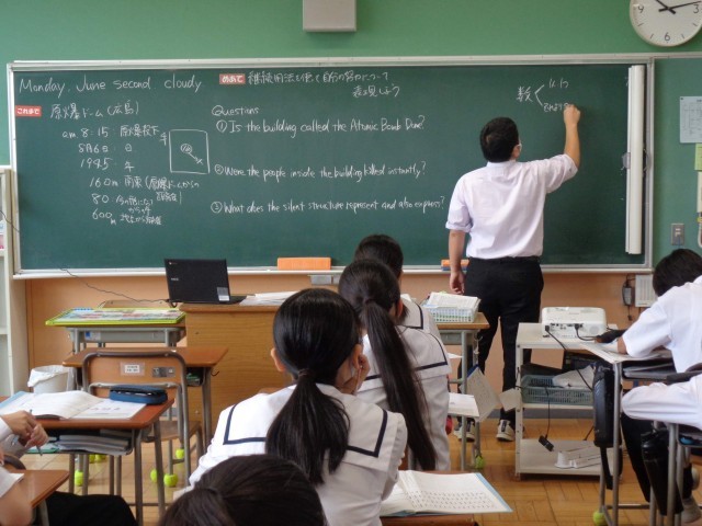 3年3組の英語は、修学旅行で広島平和祈念公園を訪れたことを題材とした英文を学習しています。