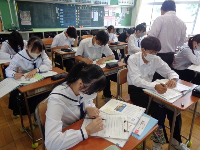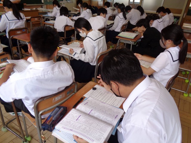今日のめあては「継続用法を使って自分の努力を表現しよう」ですが、まずは教科書の英文を読み取ります。中3ともなると難しい単語続出ですね。どんなことが書いてあるか読み取れたかな?ワークシートの問題に一生懸命取り組んでいました。