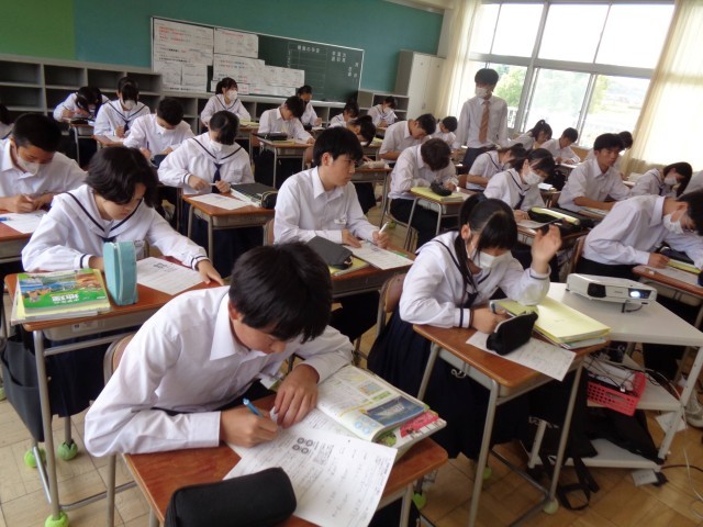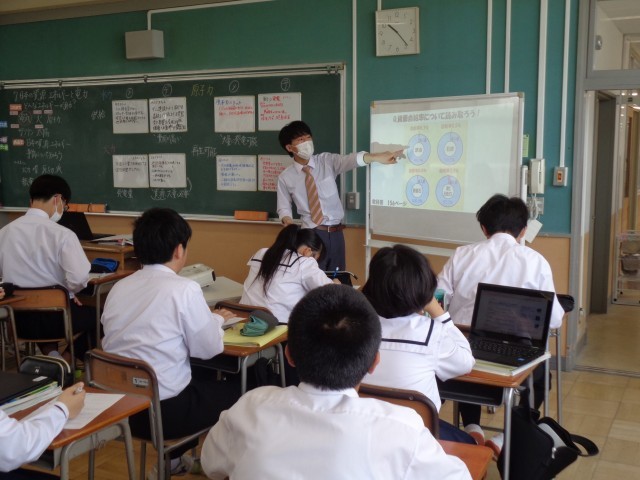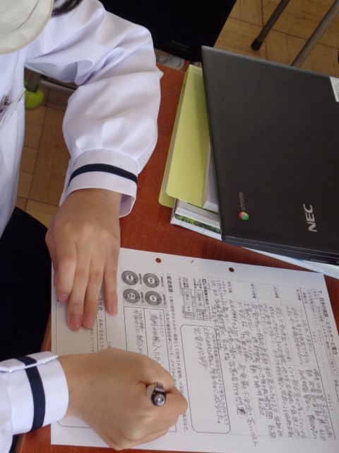 2年1組の社会科では教育実習の先生が授業をしていました。日本のエネルギー問題についての学習です。火力・水力・原子力・再生可能エネルギーの4つの発電方法を長所短所の両面から調べたり、グラブなどのデータを読み取ったりして、日本のエネルギーにはどんな課題があるのかをみんなで考えました。最後に自分の意見をまとめる活動があり、ひとりひとりがじっくり考えることができる学習でした。