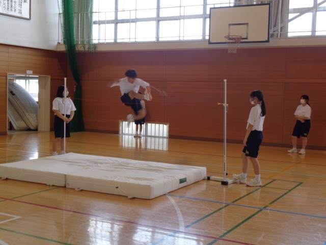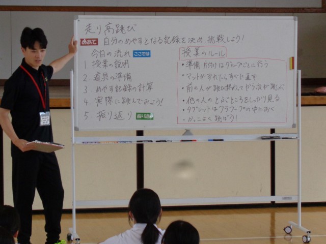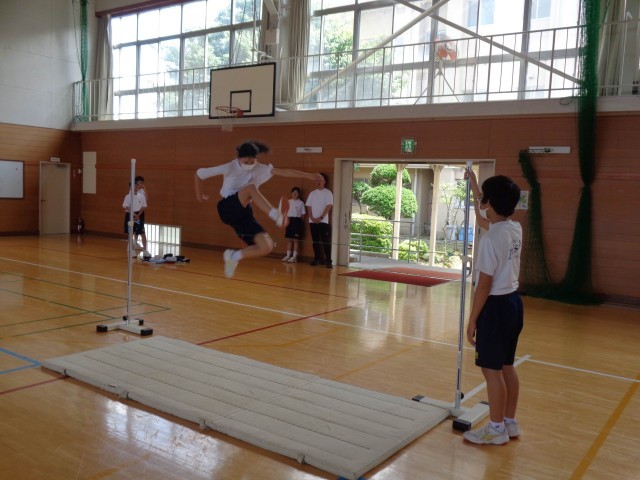 1年1組の保体も教育実習の先生の授業でした。走り高跳びの学習が始まり、今日は「自分のめやすとなる記録を決め、挑戦しよう」というめあてでした。楽しく記録に挑戦するために、グループ対抗のゲーム形式で練習に取り組みました。みんな楽しそうにそしてやる気をもって練習に取り組んでいました。グループでの協力や励まし合いの姿もとてもよかったです。