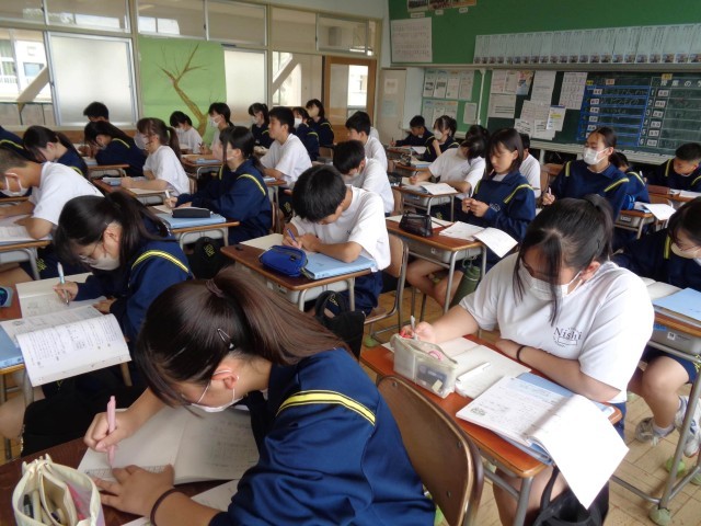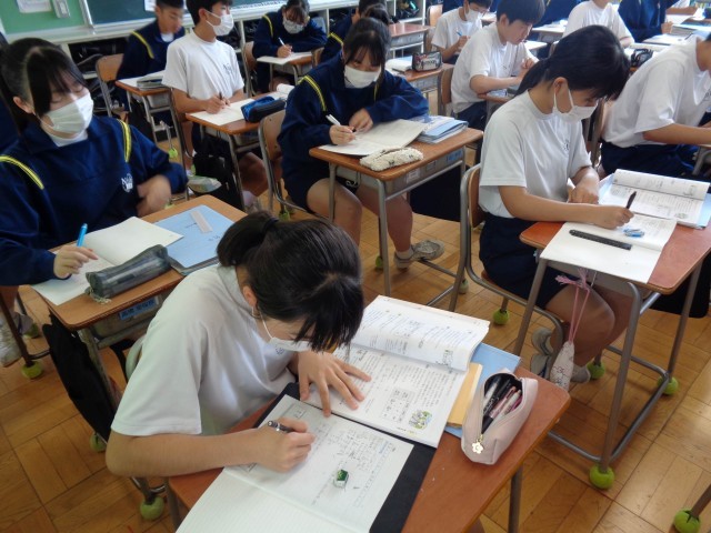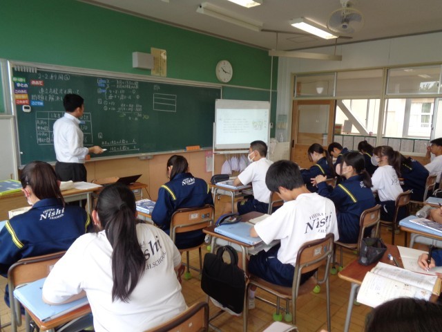 2年3組の数学の授業。連立方程式を使って問題を解く学習です。問題文に合う連立方程式を作ってそれを解くことができるかな?問題文の何にxとyを当てはめればよいのか、それを使ってどのように方程式を作るのか。一人一人が一生懸命考えて問題に取り組んでいました。