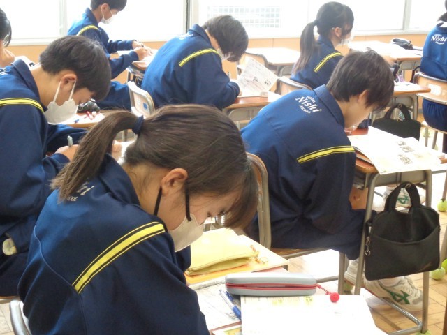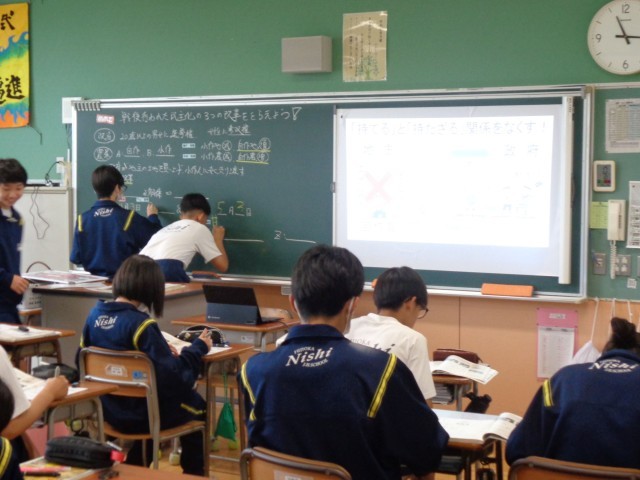 3年2組の社会科の授業。第二次世界大戦後の日本の民主化のための政策を調べていました。資料を読み取ったり教科書で調べたりして、終戦後の混乱から日本がいかに新しい国づくりをしていったかを考えました。
