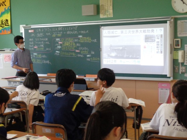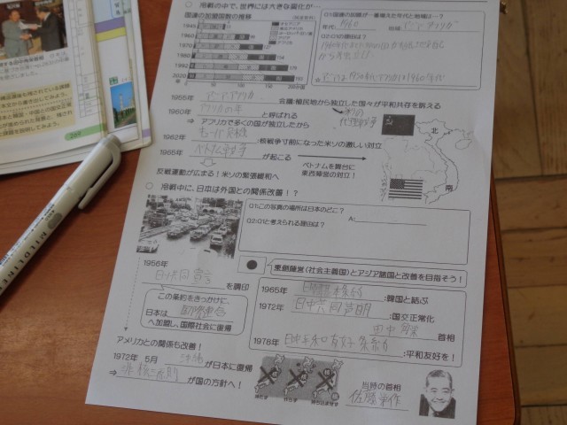 3年2組の社会科は東西冷戦中のアジア情勢についての学習です。東西冷戦がベトナム戦争などの代理戦争をもたらし大きな悲劇を生んだことやそのような情勢の中で日本が国際社会にどのように復帰していったのかを写真やグラフなどの資料をもとに調べました。