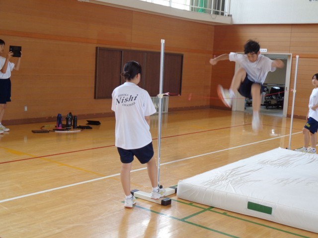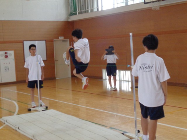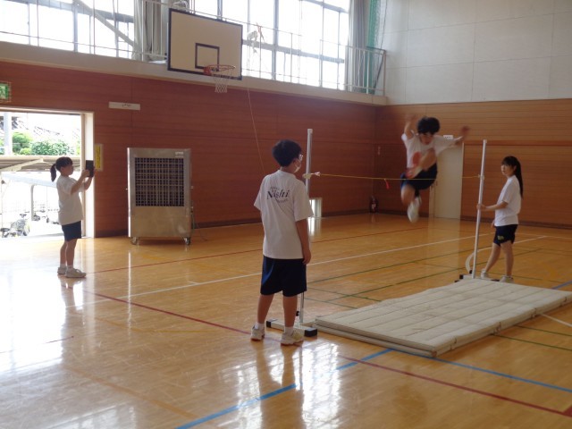 1年生の保体は走り高跳びの学習中。グループで協力し合って練習に取り組んでいました。グループでお互いのフォームをタブレットで動画撮影してフォームの改善に役立てることにします。助走からジャンプまでの動きをタブレットで追うのはちょっと難しいかな?仲間のために真剣に撮影していました。写真は2組と3組の授業の様子です。