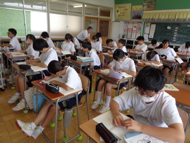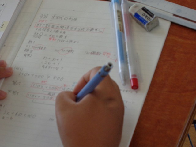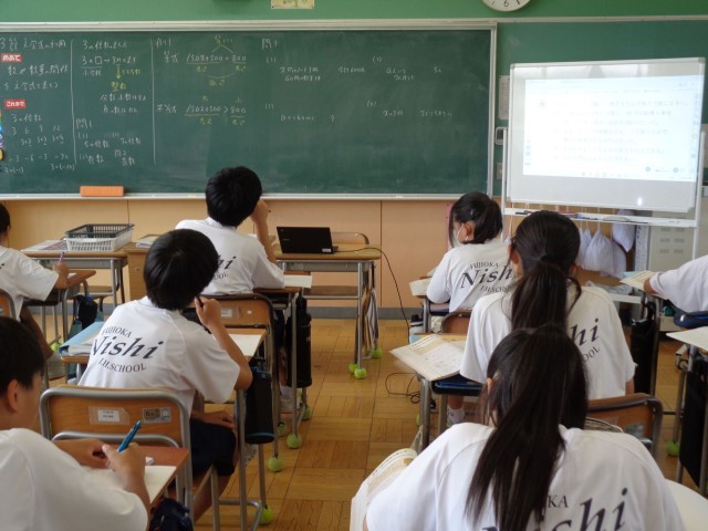 1年2組の数学の授業では、「文字式の利用」の学習をしていました。「文字式」って何?何を意味しているのかな?文字式がどんなことを表現しているのかをみんなで学び、問題を解きました。先生の発問によく反応し、学習課題に積極的に取り組んでいました。