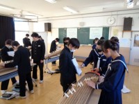 1年2組の技術科の授業。木工製作の先週の続きです。カットした木材を研磨する作業に...