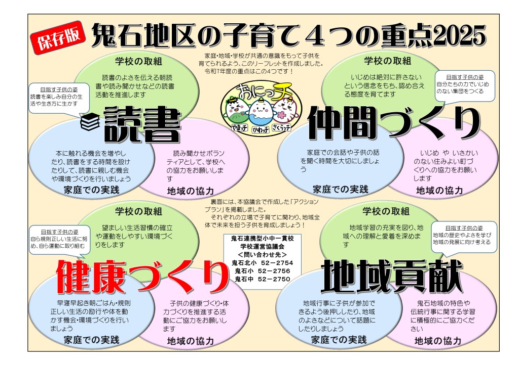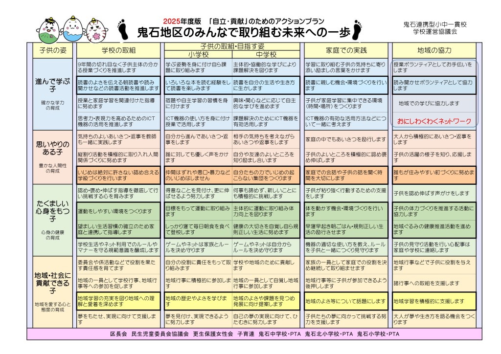 鬼石一貫校学校運営協議会では、「自立・貢献」のためのアクションプランを策定し、児童生徒、保護者、地域、学校で目指す子どもの姿や行動目標を共有し、地域一体となった子育てができるよう努めています。今年度は、「読書」「仲間づくり」「健康づくり」「地域貢献」を重点として取り組みます。